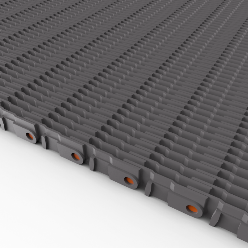 Para recorridos rectos únicamente, en planos horizontales (o pendientes mínimas). Permite transferencias en forma suave y sin desniveles asegurando la estabilidad de envases en la zona crítica (de transferencia). Su superficie de apoyo con aperturas incrementa el paso de aire, reduce la fricción y permite un excelente drenaje/escurrido de productos. Por su sistema de engrane permite la formulación de transportes bidireccionales.