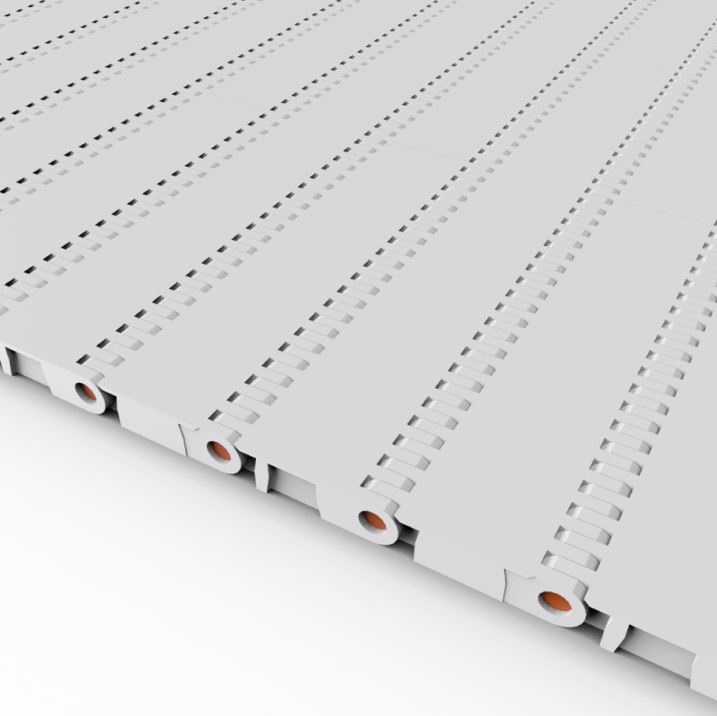 Banda Modular para el transporte pesado en diversas industrias, con superficie cerrada y reforzada. Para recorridos rectos únicamente, en planos horizontales o inclinados. Disponible con superficie de apertura 0%, permite el transporte incluyendo de tipo granular (con granos de tamaños mínimos establecidos) y con apertura 12% para el escurrimiento o inmersión en variados procesos. Por su sistema de engrane permite la formulación de transportes bidireccionales.