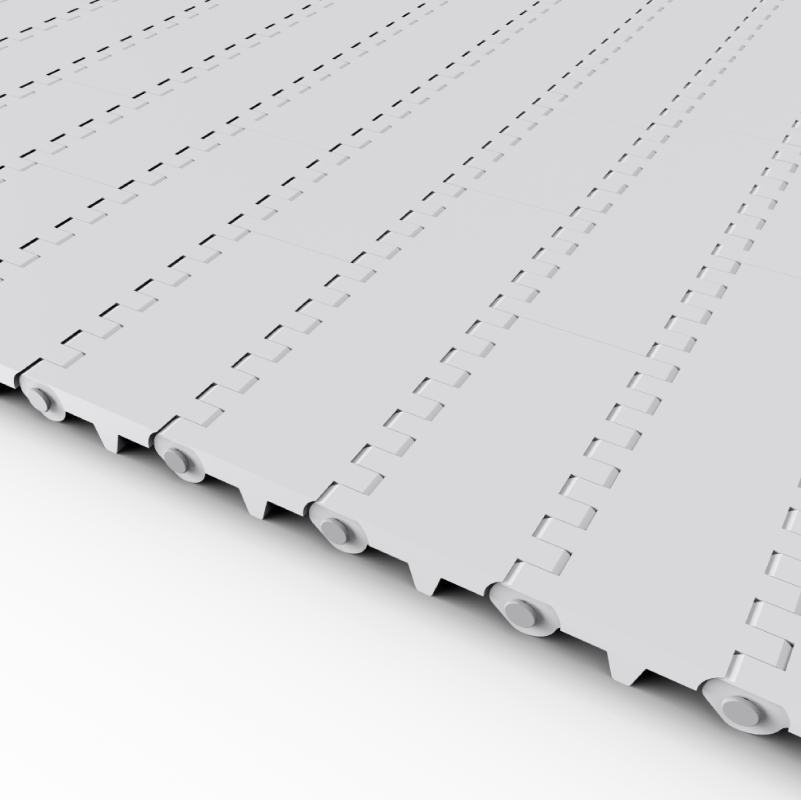 Disponible con superficie de apertura 0%, permite el transporte incluyendo de tipo granular (con granos de tamaños mínimos establecidos) y con abertura hasta el 15% para el escurrimiento o inmersión en variados procesos. En caso de grandes pendientes, ofrece la posibilidad de armado con paletas empujadoras y aletas laterales, formando cangilones para la elevación o descenso de productos. En caso de pequeñas pendientes, se incorporan módulos de material adherente (cauchos termoplásticos) que permiten la elevación o descenso de productos.